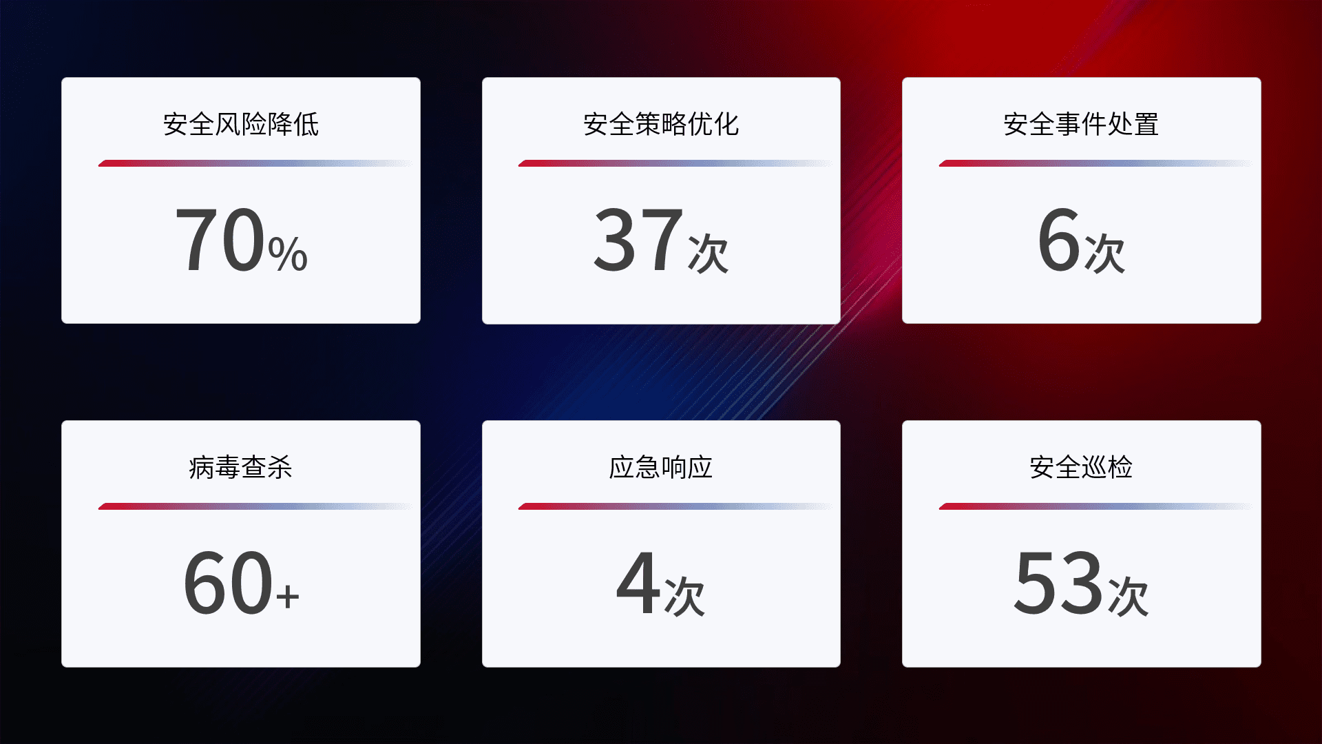 提供全面的安全事件报告体系,,,包括处置报告、、周报、、季度和年度总结,,,结合持续监控,,,,帮助客户深入了解网络安全状况。。